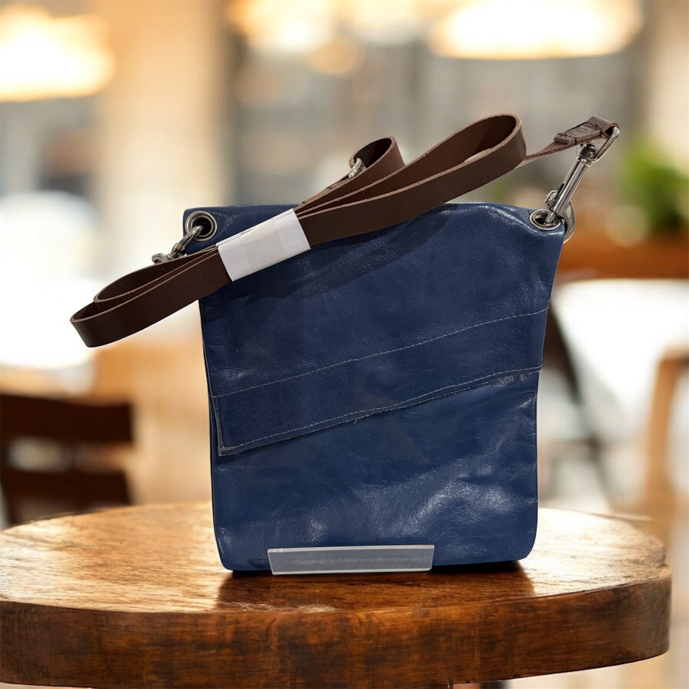 The crossbody bag is made of genuine leather. The angled fold over closure flap is secured with a stud fastener. The strap is brown leather and adjustable. Inside there is two slide in pockets.